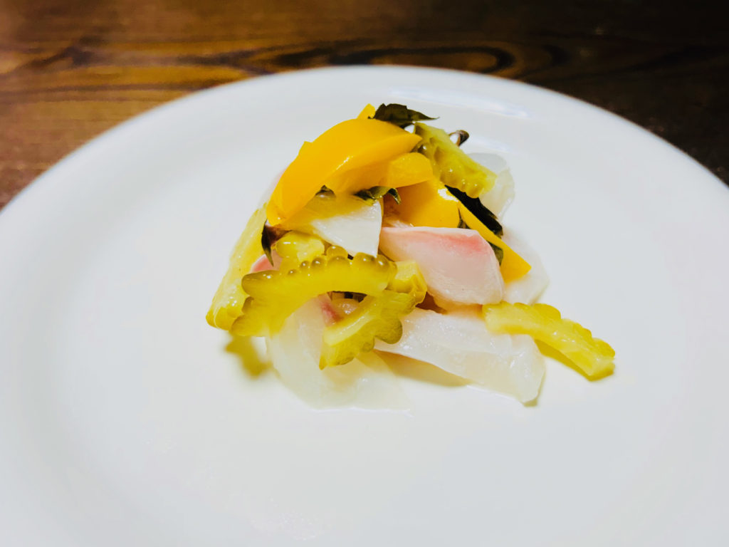 皿に盛りつけたピクルスとタイの切り身にかけて完成。