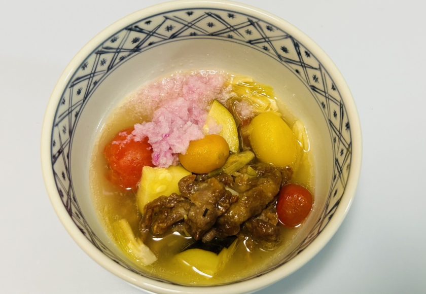 顆粒鶏ガラスープにズッキーニを入れて煮立たせ、「ミニトマトのピクルス」と「パプリカのピクルス」をピクルス液とともに入れて、豚肉の唐揚げを入れる。みぞれ鍋風に赤大根のおろしを入れる。火を止めて、薬味として刻んだミョウガをのせる。
