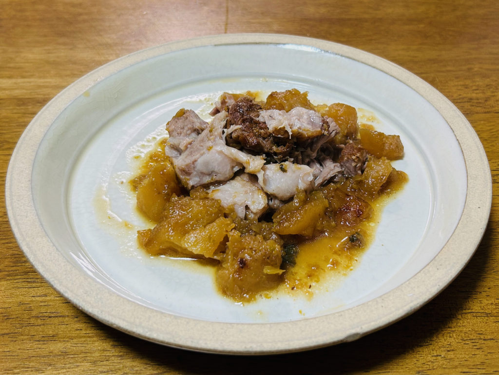 そこに、白ワイン、りんごジュース、はちみつ、しなぷなピクルス液(大さじ2杯くらい)、塩胡椒、コンソメを加えて煮立て、肉を鍋に戻す。