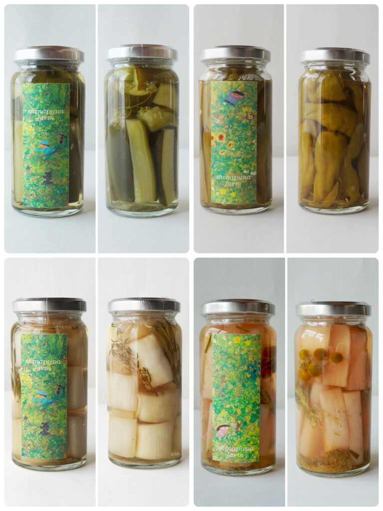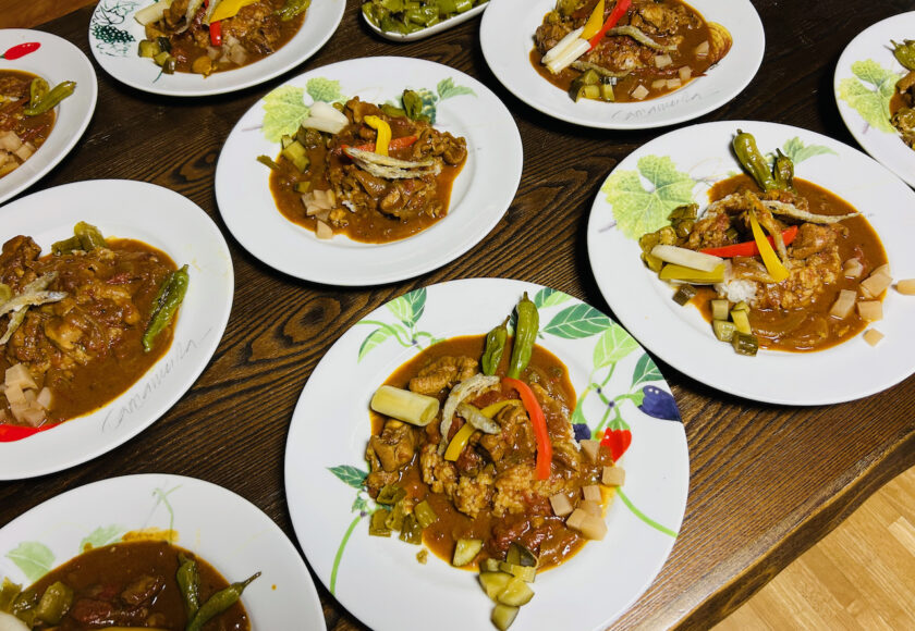 The curry in the photo is topped with four kinds of Shinapuna pickles: cucumber, shishito peppers, Japanese leeks (Naganegi), and Beni-santa salad daikon radish.