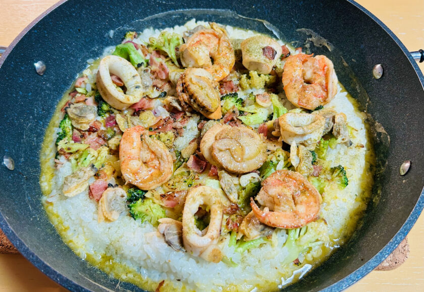 Add the lemongrass soup and the clam broth (about 400 ml for 2 cups of rice). Season with salt, pepper, and any other seasonings you like. Simmer over low heat for about 20 minutes. Add more liquid if it evaporates too much. Place the vegetables, shelled clams, shrimp, scallops, squid, and bacon on top, cover with a lid (or aluminum foil), and cook until the liquid is gone. Turn off the heat and let it steam for about 10 minutes. It’s ready to serve.