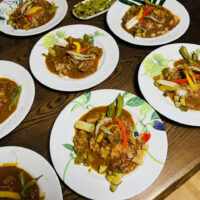 レモングラススープとアサリの出し汁(米2合に400mlほど)を加えて、塩胡椒などお好みの調理料で味付けして、弱火で20分ほど煮立たせます。水分がなくなったら足します。 野菜、アサリのむき身、海老、ホタテ、イカ、ベーコンをのせて、蓋(またはアルミホイルでカバー)をして水分がなくなったら、火を止めて10分ほど蒸らして出来上がり。
