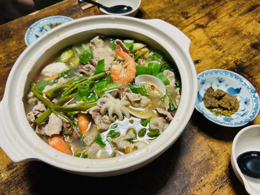 The pot shown in the photo is a hot pot made with seafood, pork, and vegetables.