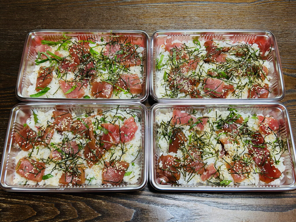 まぐろ寿司のお弁当。まぐろは漬けにして準備します。