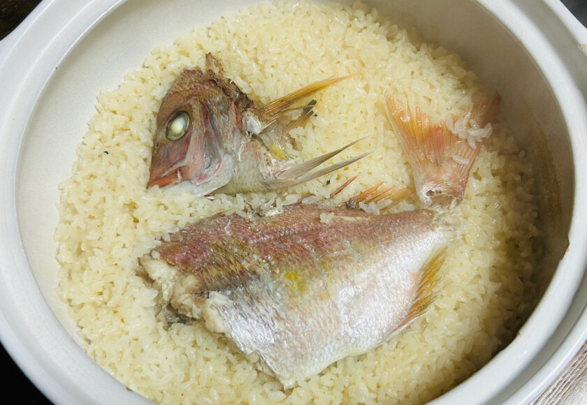 Once the rice is cooked, remove the sea bream, remove the bones and any hard-to-eat parts, then return the flesh to the pot and gently mix it into the rice.